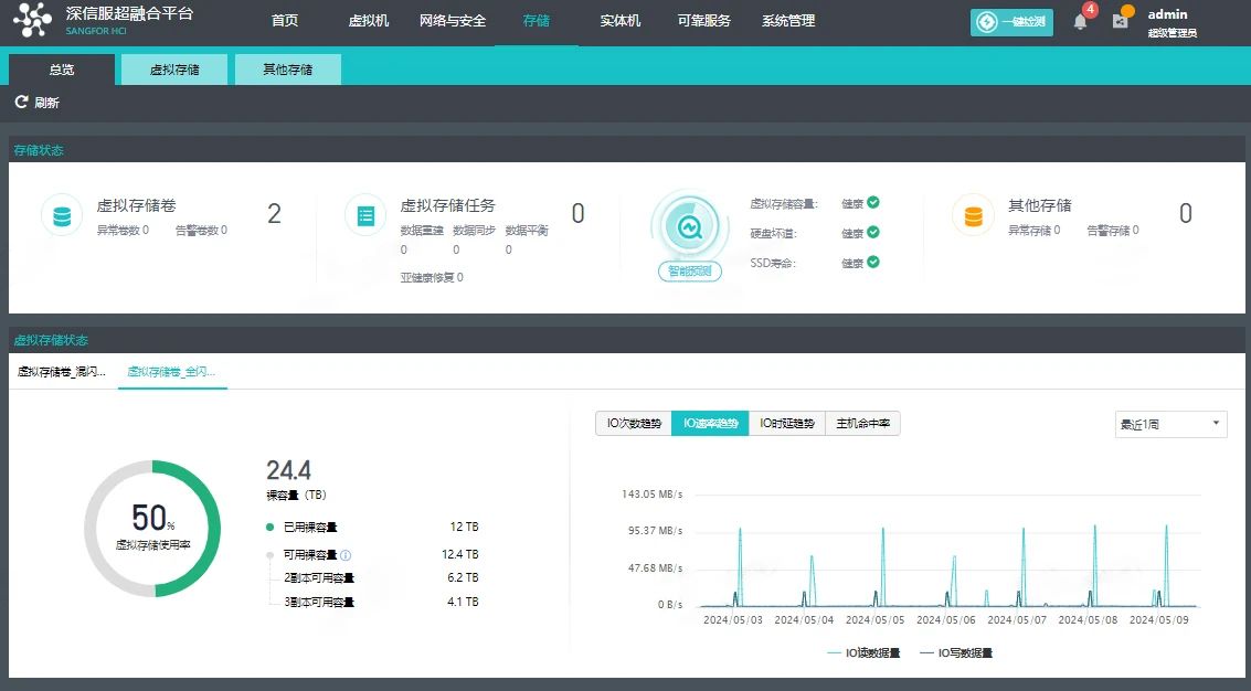 平台有2个存储,其中虚拟存储2个,1个为全闪,1个为混闪,外置存储0个,存储总容量为133.3 TB。