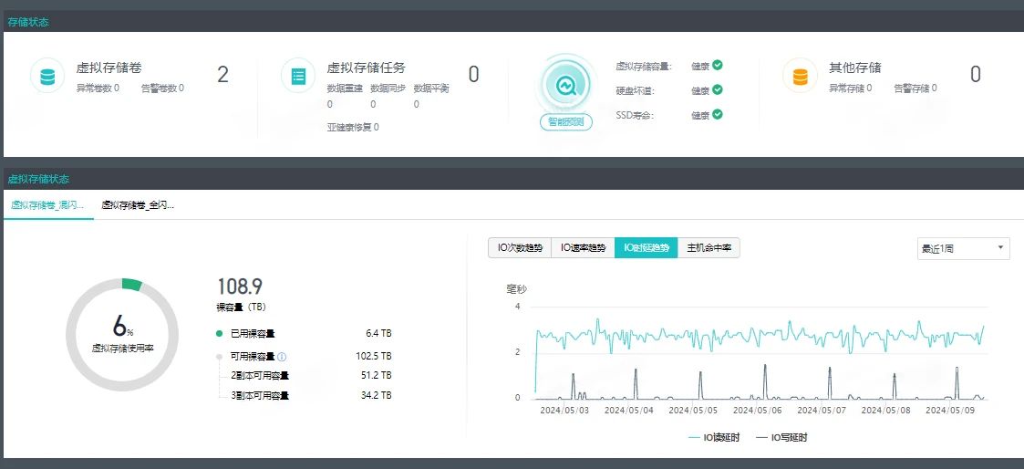 而全闪集群因为有核心数据库访问,IO吞吐量较高,目前基本已经跑满千兆网络,但因为已经采用了高性能卷,所以实际读写时延并没有因为压力的大幅增加,整体控制在2ms以内。